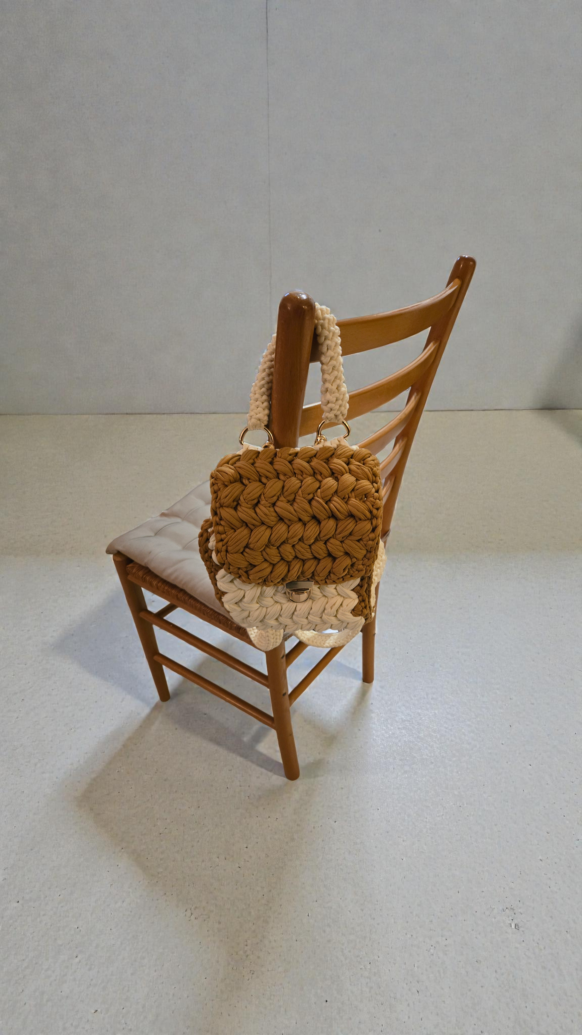 Ce mini sac à dos est entièrement réalisé à la main au crochet, avec un fil épais de qualité pour un rendu à la fois doux, solide et tendance.